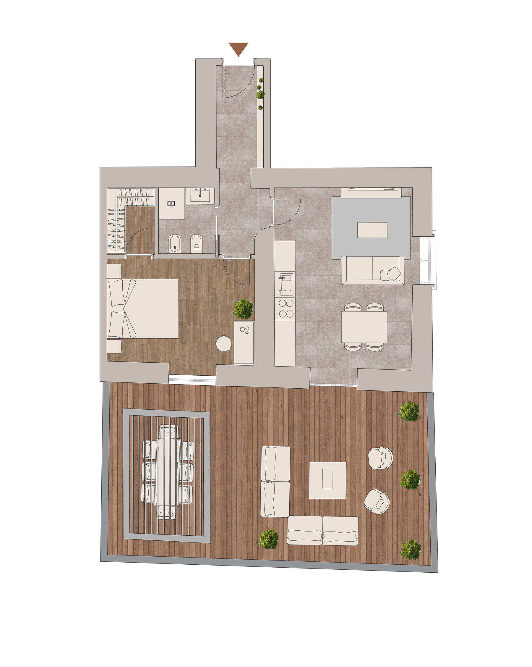 The entrance opens onto a spacious hallway that leads to a bright open-plan living area with an open kitchen and direct access to the terrace — a comfortable and versatile space. The sleeping area consists of a master bedroom with a walk-in closet and a bathroom