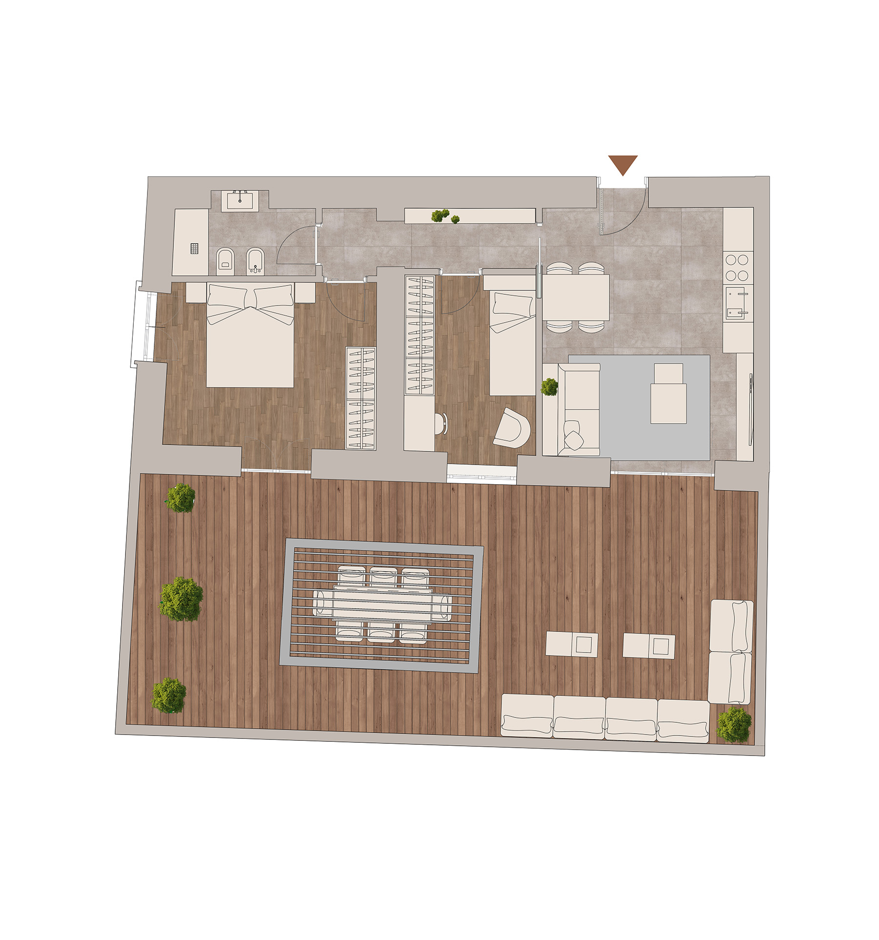 The entrance opens into a bright and spacious open-plan living area with an open kitchen and direct access to a large terrace, a comfortable and versatile space. A convenient hallway leads to the sleeping area consisting of a master bedroom, a second bedroom and a bathroom.