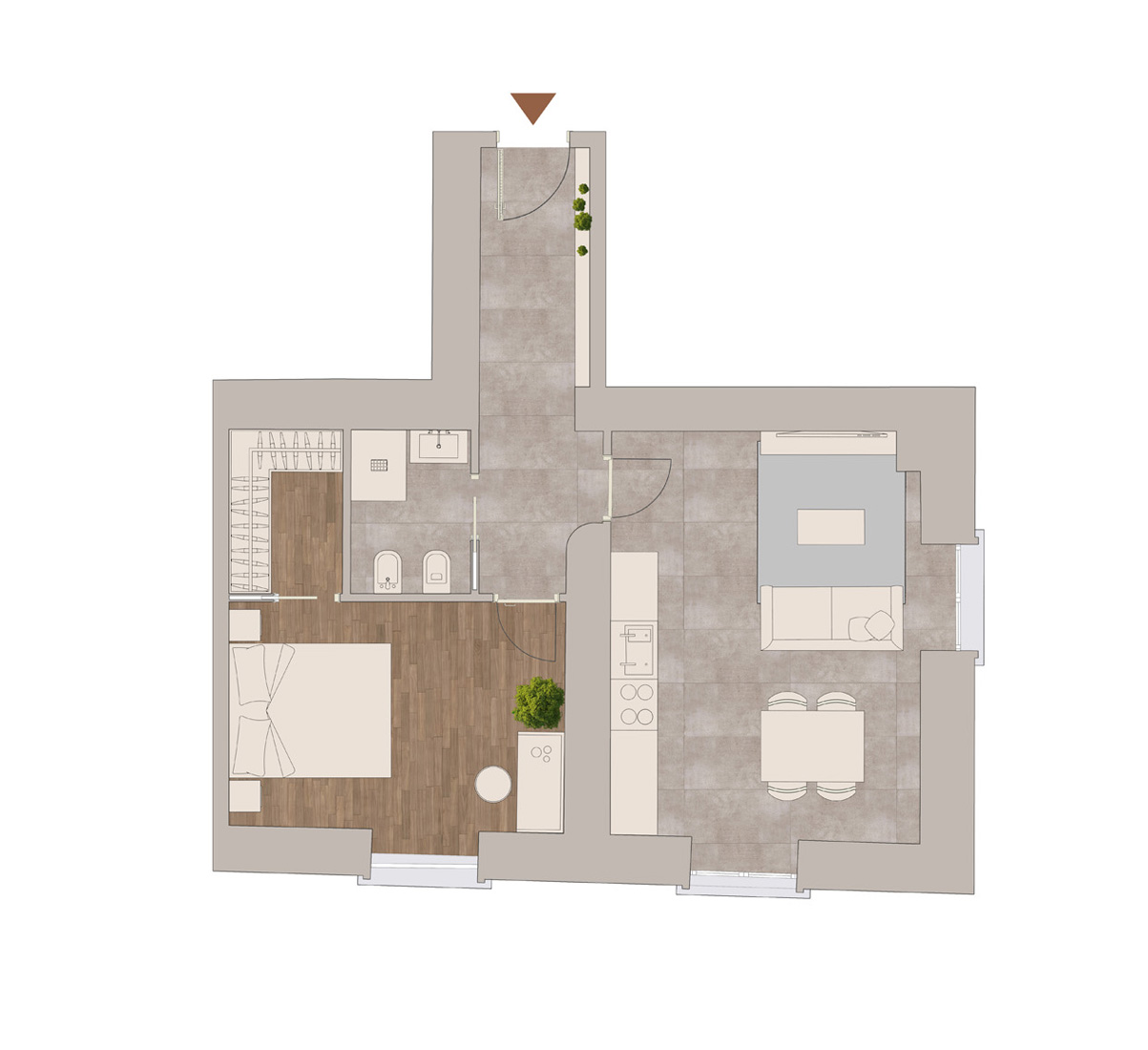 The entrance opens to a large hallway area that leads to the bright open-plan living area with an open kitchen. The sleeping area consists of a master bedroom with walk-in closet and a bathroom