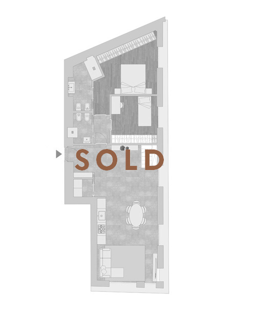 The convenient access hallway leads to a spacious and bright living area with an open kitchen and a staircase that takes you to the rooftop terrace, a comfortable and versatile space with views of the city and the sea. A bathroom completes the living area. The sleeping area consists of a master bedroom with a private bathroom, as well as a second double bedroom, also with a private bathroom.