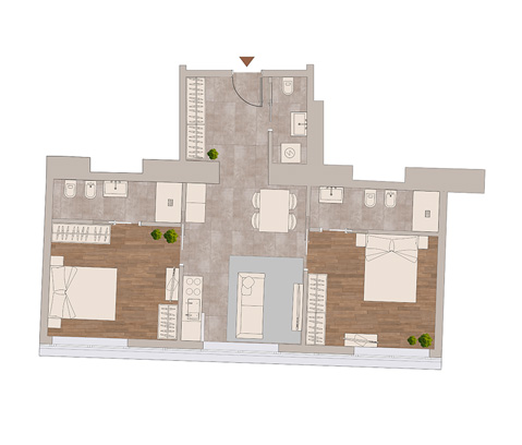 The entrance opens to the bright and spacious open-plan living room with open kitchen. The hallway leads to the sleeping area consisting of a master bedroom with private bathroom, a second bedroom and a second bathroom.