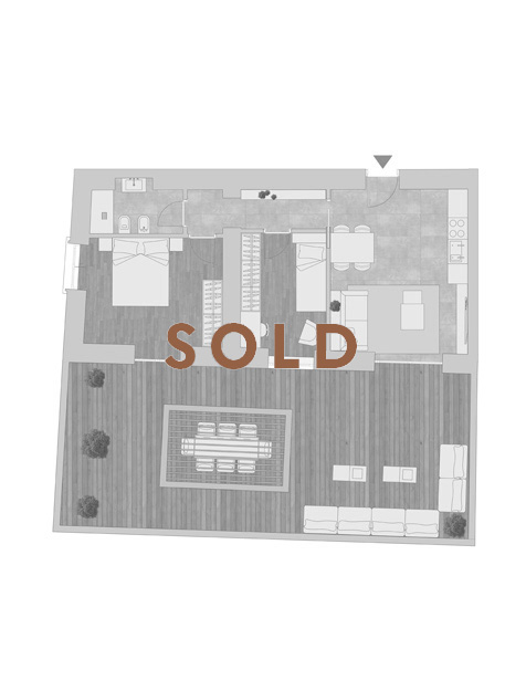 The entrance opens into a bright and spacious open-plan living area with an open kitchen and direct access to a large terrace, a comfortable and versatile space. A convenient hallway leads to the sleeping area consisting of a master bedroom, a second bedroom and a bathroom.